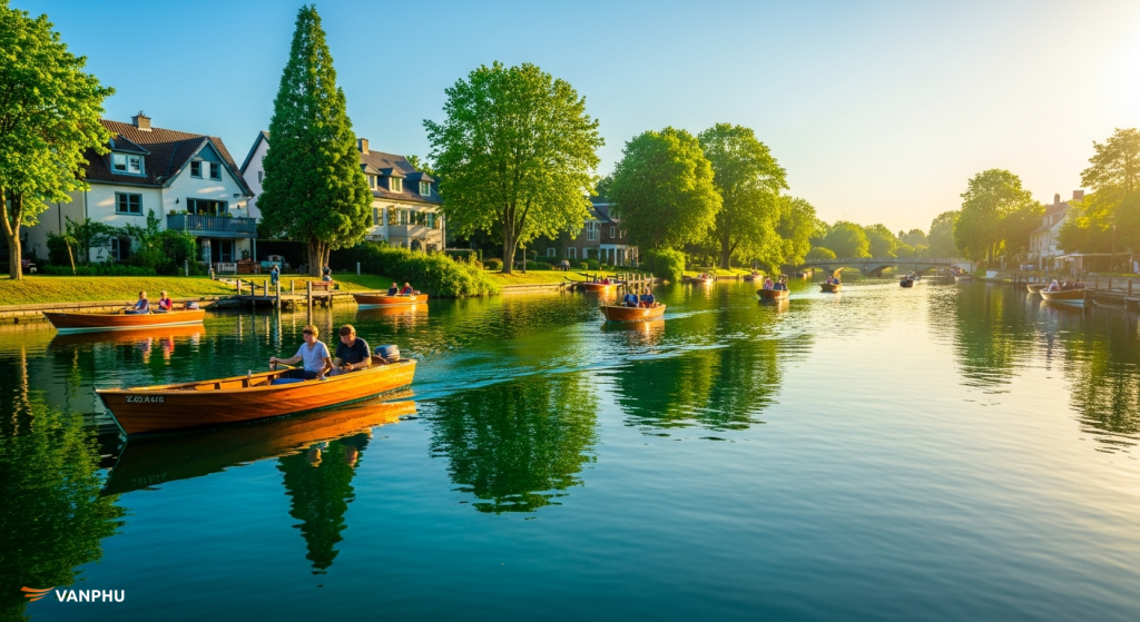 Small boats gently glide on the peaceful river, reflecting the brilliant golden sunlight, interspersed with rows of green trees and low-rise houses with unique architecture.