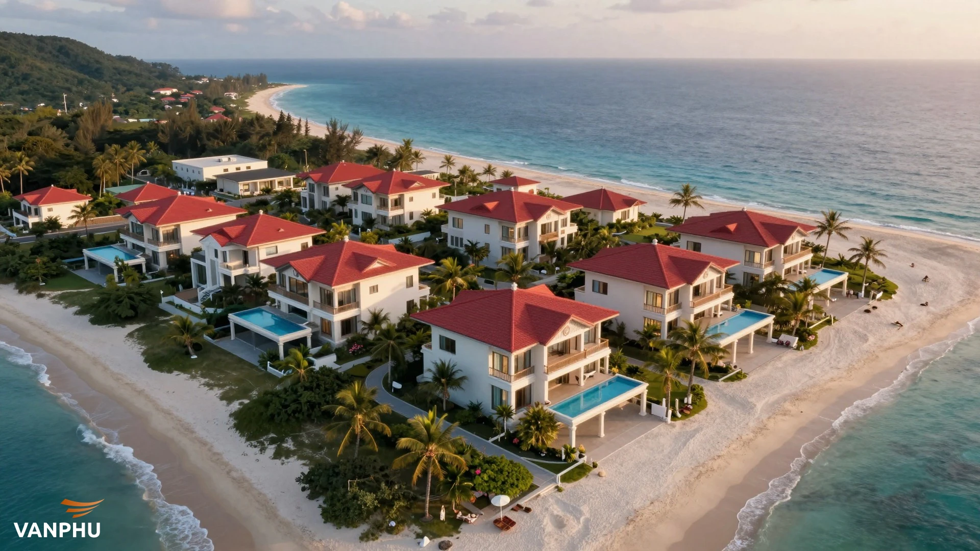 A panoramic aerial view of the Vlasta Sam Son coastal urban area, showing luxury villas with red roofs, a wide white sand beach, turquoise ocean water, and lush green landscapes under a bright sunny sky. — Image created by AI