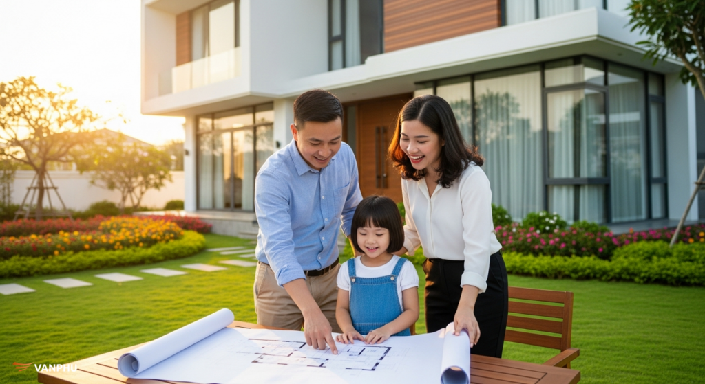 Một gia đình trẻ đang vui vẻ xem xét bản thiết kế nhà mới bên cạnh một khu đô thị xanh, hiện đại dưới ánh nắng vàng dịu.