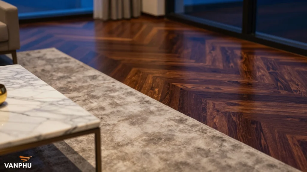 Vật liệu sử dụng trong penthouse sang trọng là minh chứng cho chất lượng và sự tinh tế [2]. Sàn gỗ cứng tối màu mang lại cảm giác ấm áp và vững chắc. Chúng tạo sự tương phản đẹp mắt với các yếu tố sáng màu trong phòng. Những tấm thảm lông mềm mại thường được bổ sung. Chúng tăng thêm sự thoải mái và sang trọng dưới chân [2].