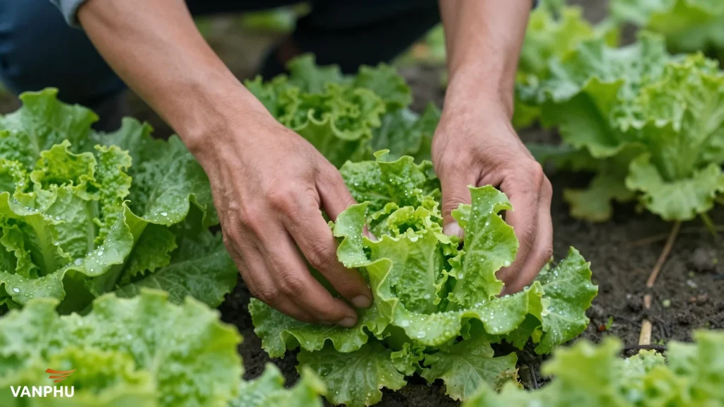 Người nông dân thu hoạch xà lách tươi ngon trong khu vườn mùa mát vào buổi sáng sớm. — Image created by AI