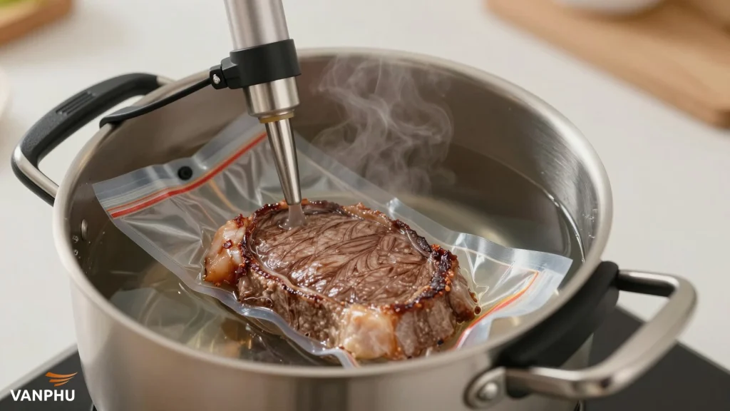 Một thiết bị Sous Vide đang hoạt động, nấu chín miếng bít tết trong túi chân không dưới nước được kiểm soát nhiệt độ chính xác. — Image created by AI
