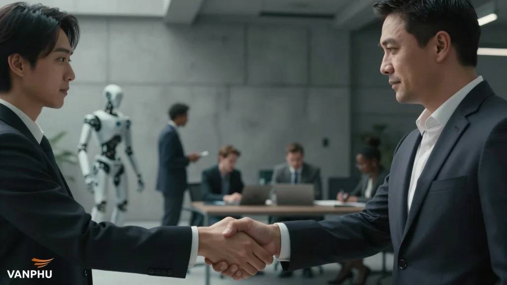 Hai chuyên gia kinh doanh từ các nền văn hóa khác nhau bắt tay, thể hiện sự giao tiếp đa văn hóa thành công trong môi trường làm việc hiện đại. — Image created by AI