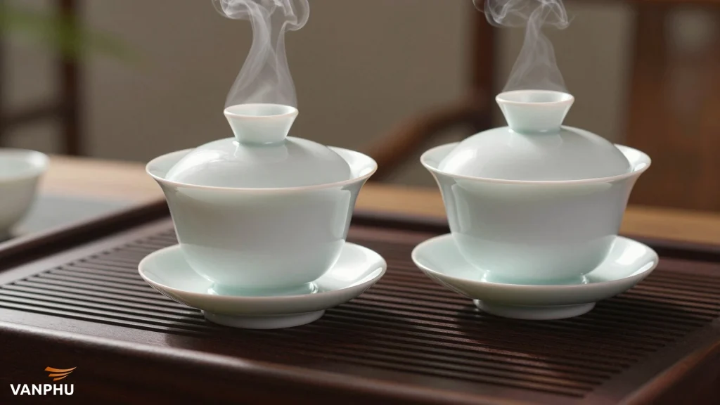 - Sứ trắng tinh khiết: Gaiwan sứ trắng trơn là tiêu chuẩn trong ngành để nếm trà chuyên nghiệp[3]. Nền trắng trung tính cho phép bạn quan sát màu sắc nước trà một cách chính xác, trong khi tính trung tính của vật liệu đảm bảo không có sự can thiệp hương vị[3].