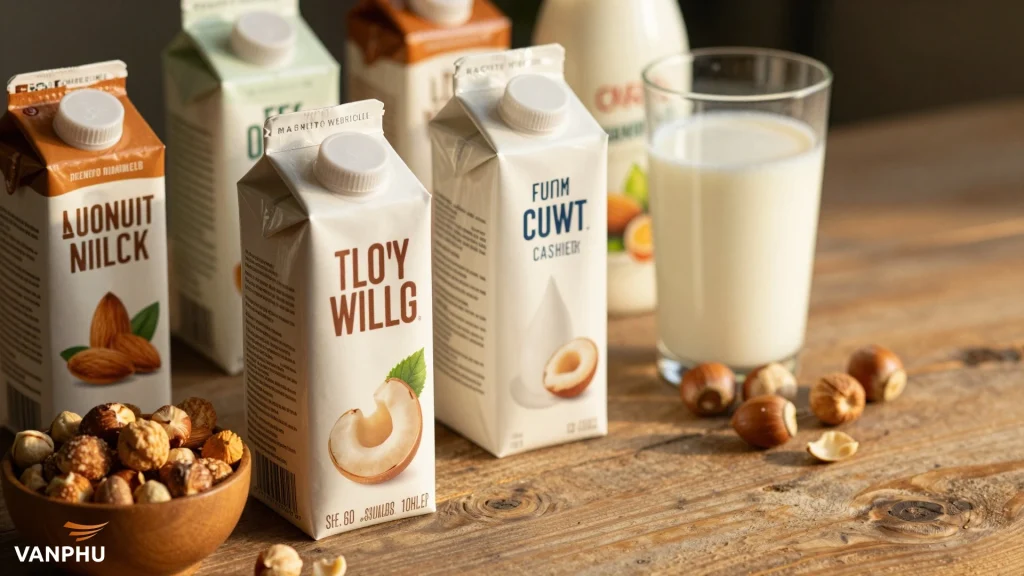 Các loại sữa hạt phổ biến như sữa hạnh nhân, sữa điều và sữa hạt phỉ mang đến hương vị và kết cấu đa dạng. — Image created by AI