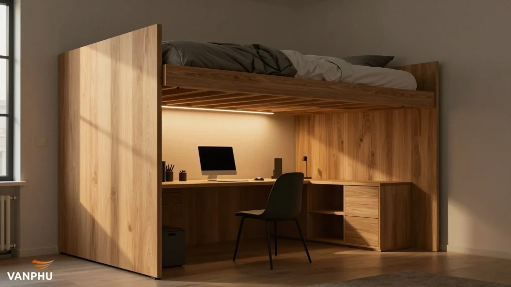 Giường thông minh thường được sản xuất từ gỗ công nghiệp MDF chống ẩm hoặc gỗ tự nhiên, kết hợp với khung sắt sơn tĩnh điện siêu chịu lực [5]. Sự kết hợp này đảm bảo độ bền lên tới hàng chục năm, xóa tan nỗi lo về việc đồ đa năng nhanh hỏng. Việc tận dụng không gian theo chiều đứng thay vì chiều ngang chính là chìa khóa của thiết kế hiện đại.