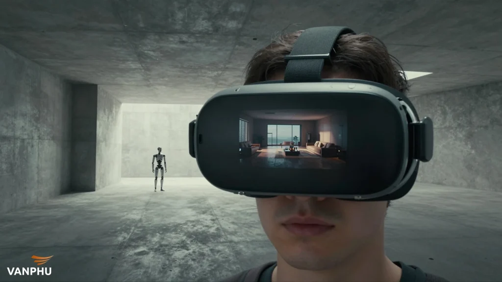 Một người đang trải nghiệm chuyến tham quan nhà thực tế ảo qua kính VR, cho thấy sự chân thực của công nghệ. — Image created by AI