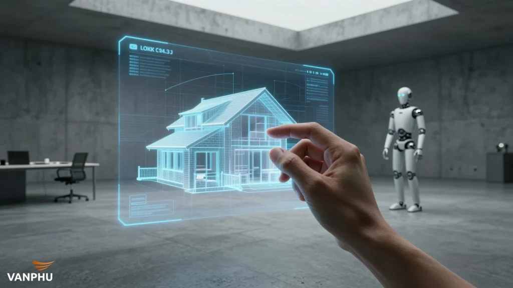 Một nhà thiết kế đang tương tác với mô hình 3D ba chiều của ngôi nhà, tùy chỉnh các chi tiết nội thất. — Image created by AI